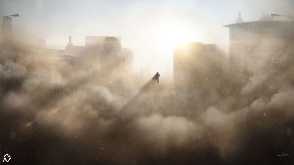 Quizás lo más impactante sea la representación del artista conceptual sénior Evan Whitefield de Superman sosteniendo un edificio en derrumbe hasta que todos los civiles escapen, para luego resurgir de entre los escombros. La composición, en contrapicado, enfatiza el sacrificio del héroe, con un cálido polvo dorado y una iluminación dramática que crea una atmósfera casi celestial que lo transforma en un símbolo de esperanza que emerge de la destrucción.