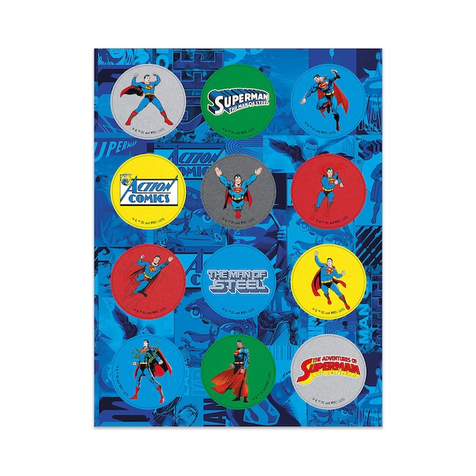 El paquete de sellos con licencia oficial de Superman incluye una hoja de nueve sellos temáticos MyStamps con 12 pegatinas, presentados en una carpeta de alta calidad.