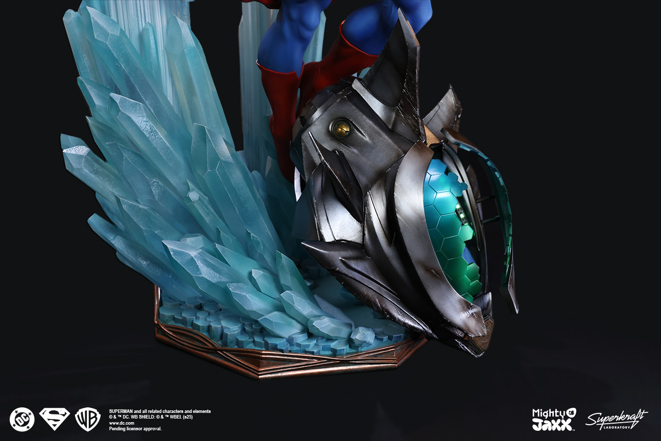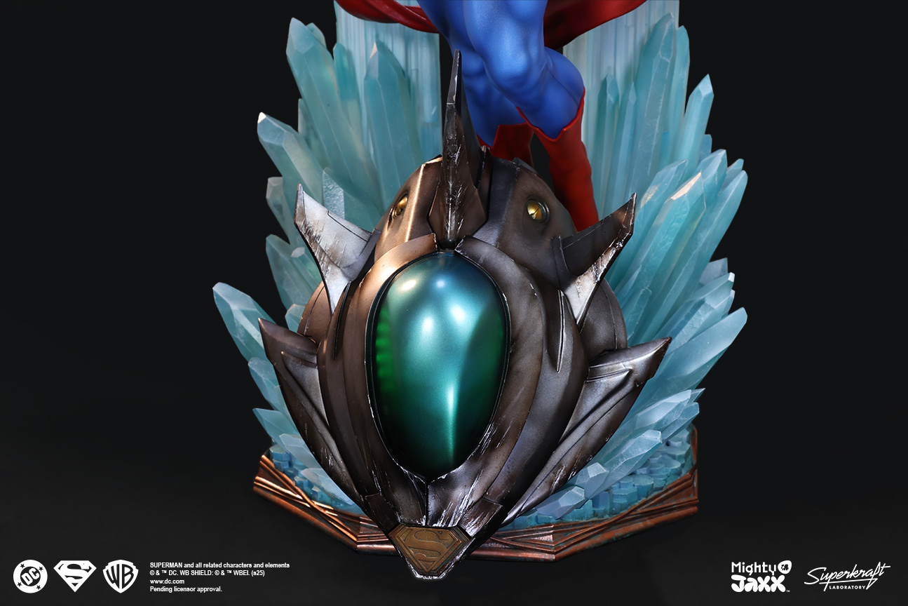 Superman: El Nacimiento de la Esperanza captura la esencia del viaje del Hombre del Mañana: desde su huida de Krypton hasta su surgimiento como protector de la Tierra. En el centro se encuentra la cápsula de escape kryptoniana de Superman, que simboliza su llegada a la Tierra. Detrás de ella, el propio Superman se yergue imponente, con su capa ondeando en forma de "S". La base está inspirada en la Fortaleza de la Soledad y esculpida en resina translúcida para evocar el santuario de Superman. El resultado es una pieza impresionante que une el pasado, el presente y el eterno símbolo de resiliencia de Superman.