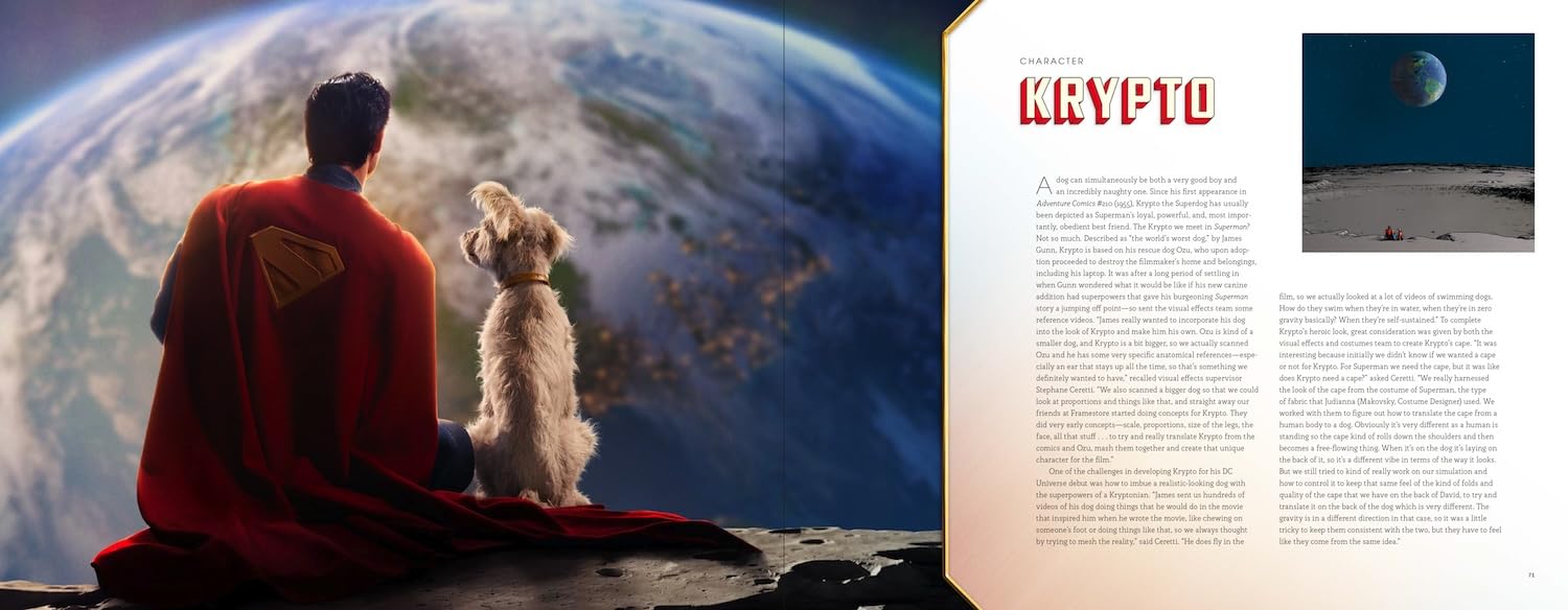 Se incluyen Metrópolis, inspirada directamente en el arte del cocreador de Superman, Joe Shuster; la impactantemente hermosa Fortaleza de la Soledad; las oficinas del Daily Planet; y otras locaciones de la película; junto con diseños de vestuario y personajes para Superman (David Corenswet); Lois Lane (Rachel Brosnahan); Lex Luthor (Nicholas Hoult); Linterna Verde (Nathan Fillion); Hawkgirl (Isabel Merced); Metamorpho (Anthony Carrigan); Mr. Terrific (Edi Gathegi); y, por supuesto, Krypto, el Superperro.