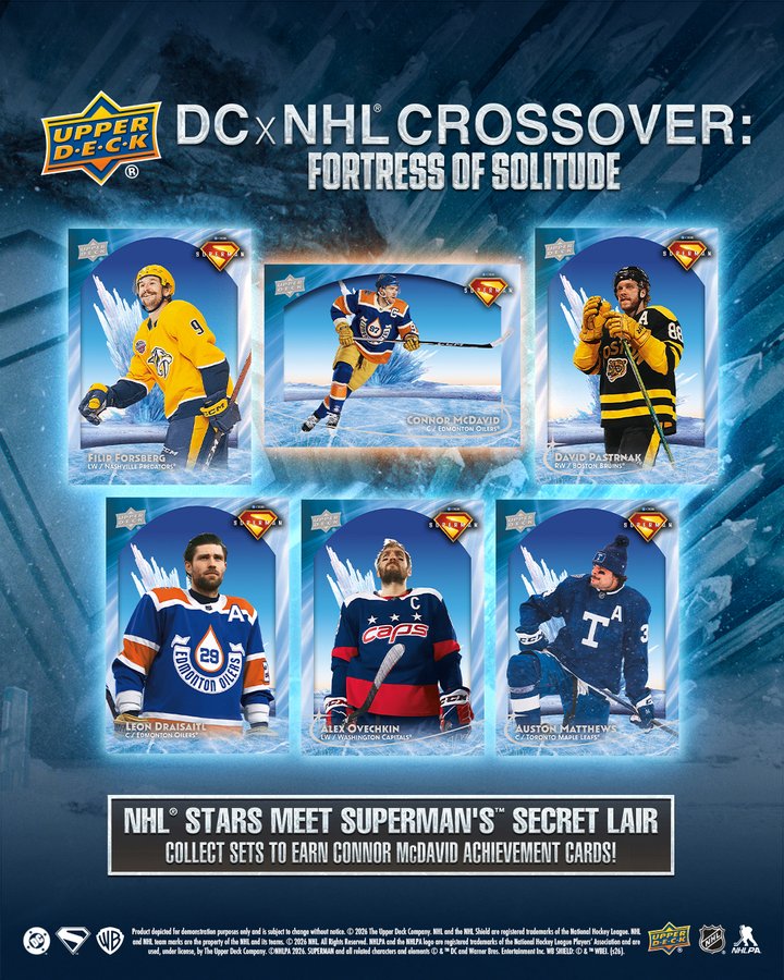 Inspirado en la Fortaleza de la Soledad de "Superman", este set de tarjetas coleccionables destaca imágenes de acción de seis superestrellas mundiales de la NHL en el santuario secreto de Superman. Con el brillo iridiscente y la textura de la Fortaleza, el set incluye imágenes de Alex Ovechkin, Sidney Crosby, Leon Draisaitl, Filip Forsberg, Auston Matthews y David Pastrnak. Los coleccionistas que completen el set completo de seis tarjetas recibirán una tarjeta exclusiva de logro de Connor McDavid.