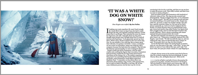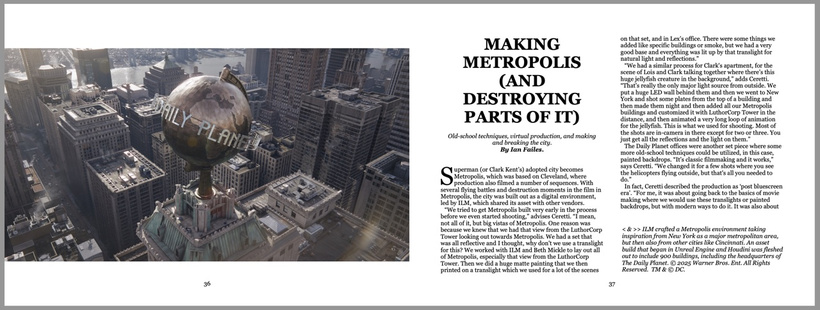 El número también abarca la creación de Metrópolis y la secuencia de batalla a gran escala del Martillo de Boravia, junto con un enfrentamiento épico entre Superman y un imponente kaiju. Los equipos de efectos visuales también contribuyeron a la creación del universo de bolsillo diseñado por Lex Luthor, que incluye un río antiprotones y una secuencia visualmente compleja con Mister Terrific. El duelo culminante entre Superman, el Ingeniero y Ultraman es el artículo principal de la revista.
