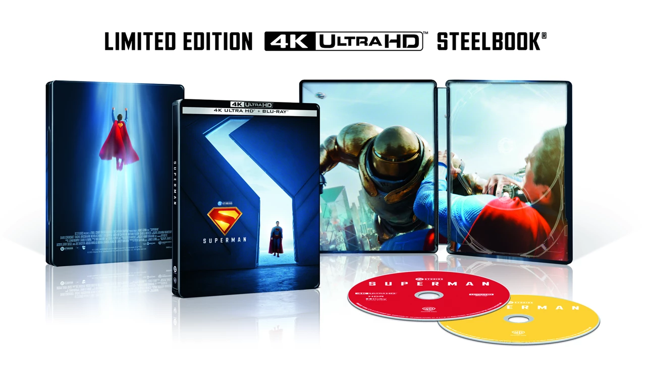 Esta edición exclusiva presenta la película en una impresionante resolución 4K Ultra HD y está acompañada de una amplia gama de contenidos especiales. Los espectadores podrán explorar un documental completo sobre el making-of con James Gunn y miembros clave del reparto, análisis a fondo del renovado Daily Planet, un perfil de Lex Luthor basado en la actuación de Nicholas Hoult y un análisis de la Banda de la Justicia en su debut en el nuevo Universo DC. Otros segmentos abarcan la creación de Krypto, el desarrollo del villano principal de la película y una mirada profunda al legado de Superman, Lois Lane y Lex Luthor. Las entrevistas con Gunn y Peter Safran describen el futuro de DC, mientras que un artículo dedicado presenta la banda sonora de la película, compuesta por John Murphy y David Fleming. La colección también incluye el cortometraje animado original centrado en Krypto, "Paws to Pixels: Krypto is Born".