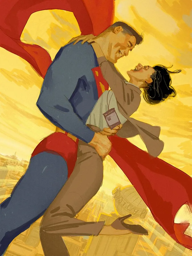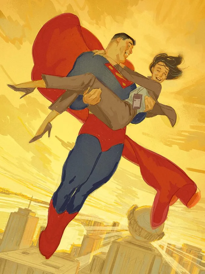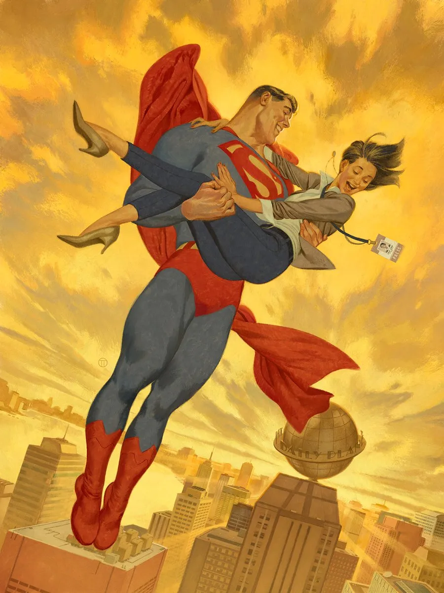 Mira, arriba en el cielo! Es fácil ver lo enamorados que están Superman y Lois Lane mientras vuelan por encima de Metrópolis en esta encantadora ilustración. Incluso el edificio del Daily Planet parece pequeño cuando la insignia de prensa de Lois ondea alrededor de su cuello y la capa de Kal-El ondea con la brisa. Para el kryptoniano, volar sobre la ciudad es un espectáculo habitual, razón por la cual solo tiene ojos para la intrépida reportera mientras ella contempla la increíble vista desde la perspectiva de su novio.
