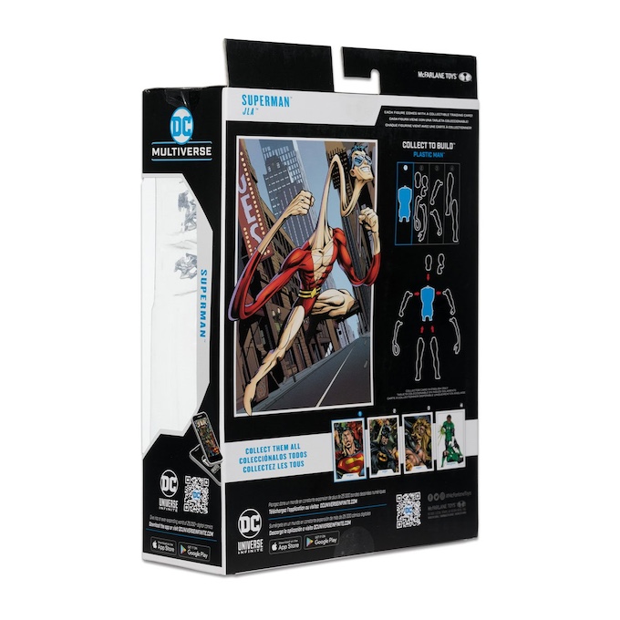 La figura de acción a escala de 7 pulgadas de Superman de la Liga de la Justicia de América DC Build-A Wave 12 contiene hasta 22 puntos de articulación, 4 efectos de energía y una base de exhibición. Superman también viene con una tarjeta coleccionable con ilustraciones en el frente y una biografía del personaje en el reverso. También se incluye una figura Build-A. Colecciónalos todos (se venden por separado) para construir a Plastic Man.