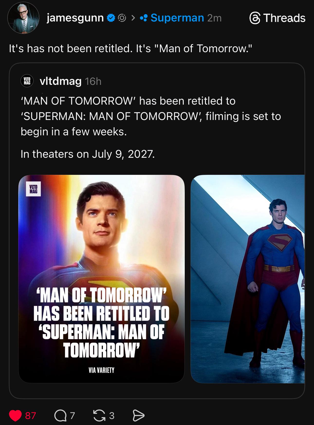 Es aquí donde entra James Gunn, que en su cuenta de Threads desmintió que la película haya cambiado su título: "No ha sido re-titulado. Es 'El hombre del mañana. '".