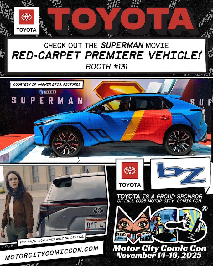 Toyota se enorgullece de patrocinar la Motor City Comic Con de otoño de 2025. Visita el stand n.° 131 y descubre el vehículo que apareció en la alfombra roja del estreno de la película "Superman" (Toyota bZ).