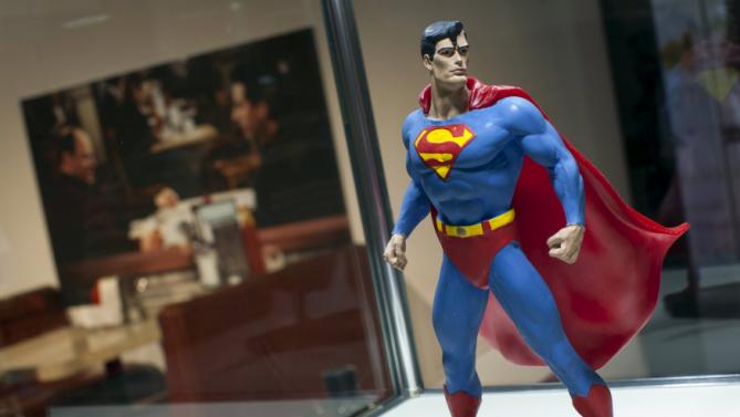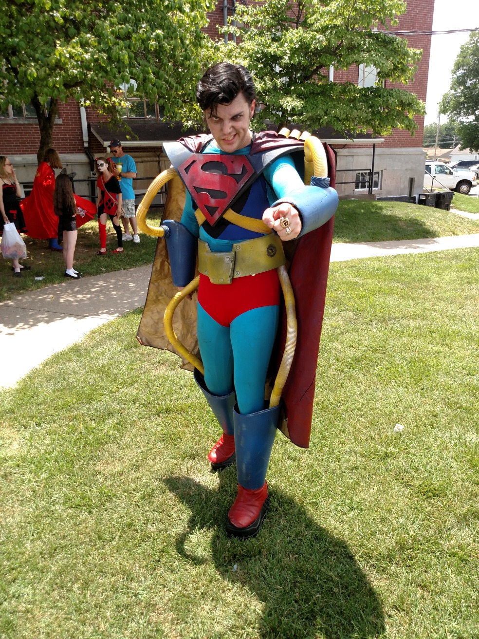 Un hombre vive de lo que vende, vestido como el Hombre de Acero.
